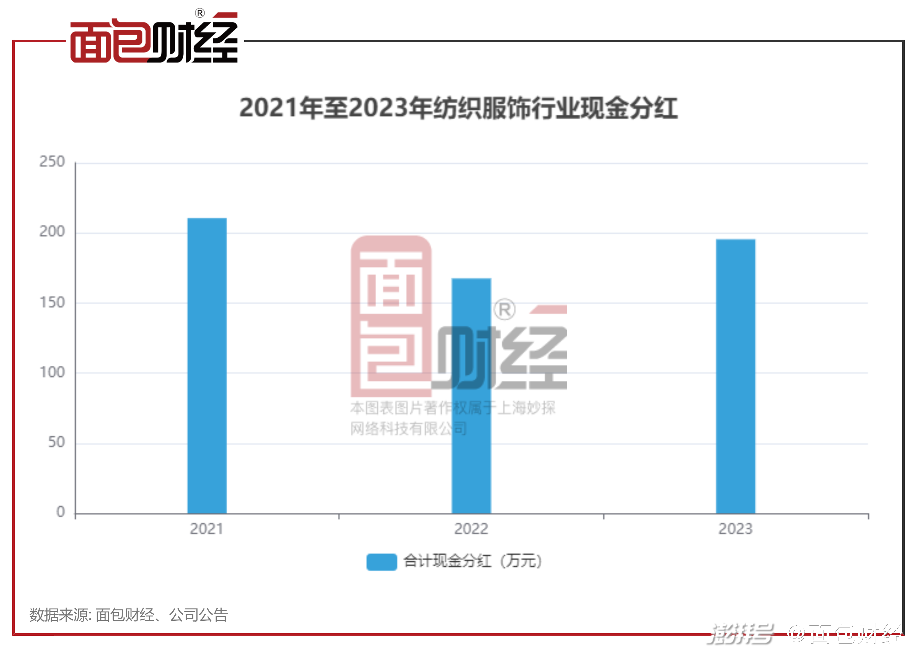 面包財經梳理公開資料顯示,按照申萬一級行業分類,紡織服飾行業企業2023年現金派息金額(不包括回購等視同現金分紅的情況,下同)合計195.45億元,較2022年增加約27.94億元。