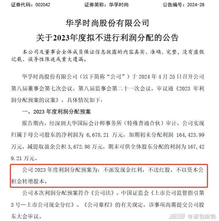 華孚時尚關于2023年度擬不進行利潤分配的公告顯示,公司2023年度利潤分配預案為:不派發現金紅利,不送紅股,不以資本公積金轉增股本。