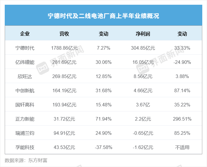 鋰電池企業(yè)期中考成績(jī)單公布,二線企業(yè)上半年整體業(yè)績(jī)同比改善,“寧王”繼續(xù)一大獨(dú)大。